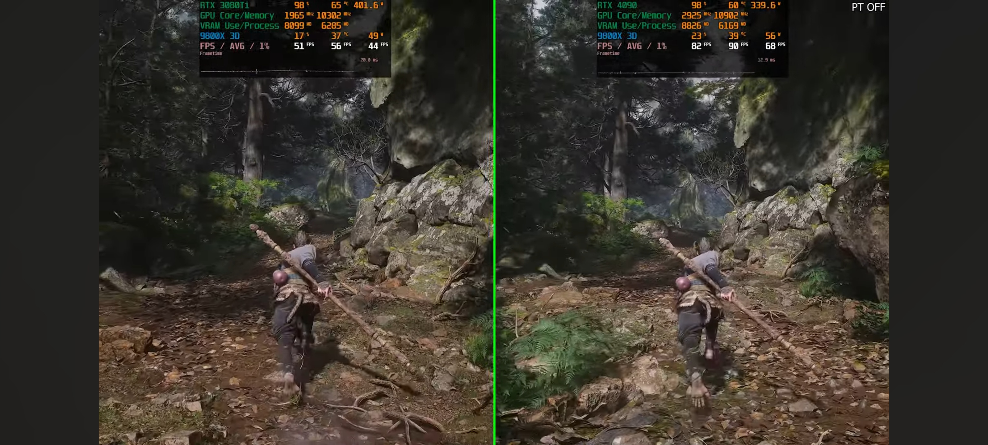 Here's screenshot from the same youtube video (Terra Ware : RTX 4000 generational uplift over RTX 3000), but with lumen instead of PT and the difference isnt nowhere as big compared to previous comparison that used PT.