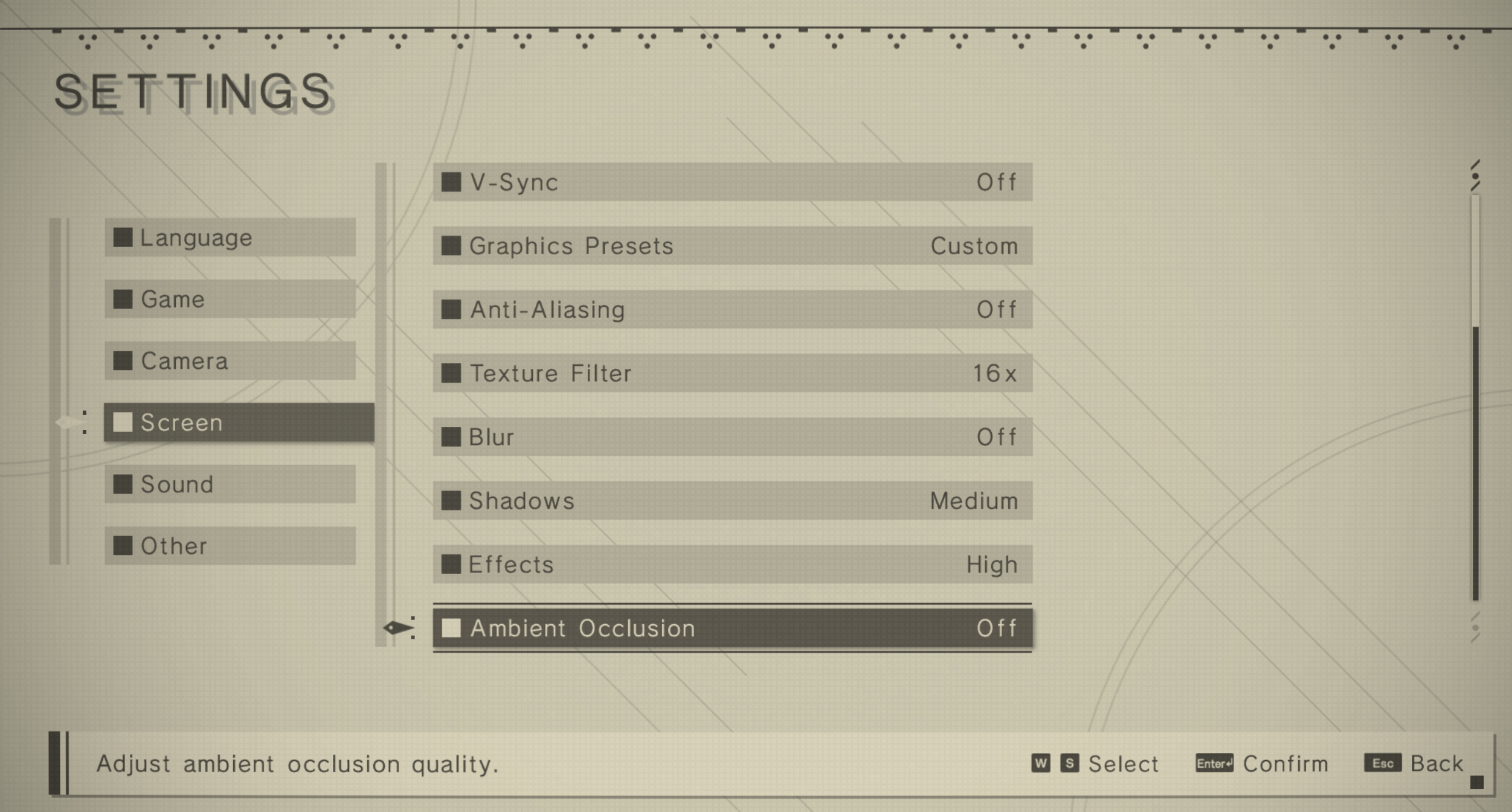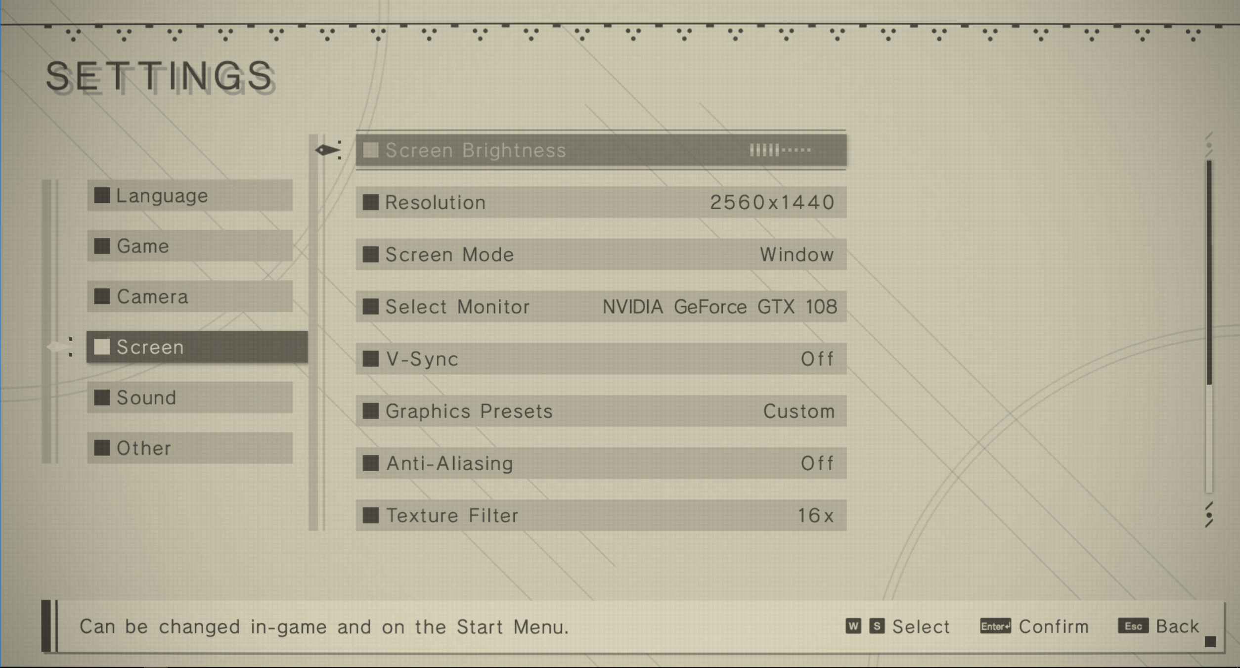 TFW your brand new game has a worse options menu than a remaster of a 20 year old N64 game (Turok 2). I want to love NieR, but this is just abyssmal by any measure.