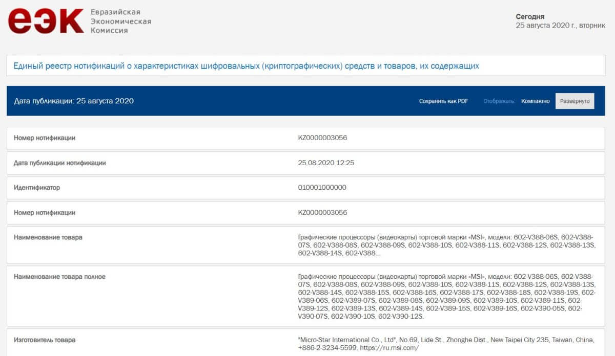 MSI has recently submitted multiple Ampere RTX graphics cards to the Eurasian Economic Commission, a total of 29 different SKUs. MSI has registered them as video cards, but without the actual GPU nomenclature. According to the listing of the EEC database three different GPU models are detailed, having different variations. There are the 602-V388, 602-V389, and 602-V390 SKUs, and if we go by MSI’s previous nomenclature, the lower number seems to be related to the high end cards.