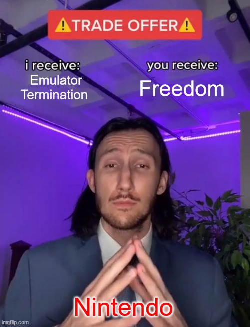 For Nintendo and their cultists, video games preservation is theft and competition is crime. Under their mob rule, our future generation will not be able to enjoy what we currently do, and parallel economy will be outlawed. No legacy, only disposable live services. No market, only monopoly.