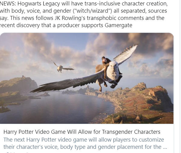 Warning about the Harry Potter game. Devs support mental illness and genital mutilation. https://uploads.disquscdn.com/images/de0c46339f9b467ebbb5049e71d11b99f43b627e094045d6fc8c771aa21dc0ef.png
