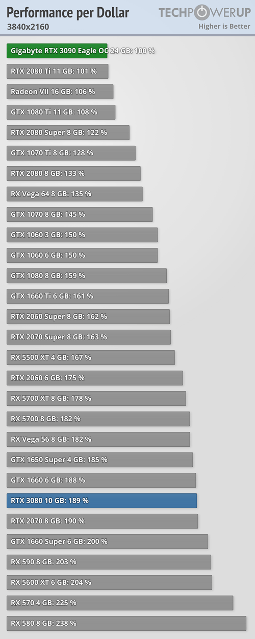 One of the things that I like about TechPowerUp reviews is that W1zzard does performance per dollar charts. The RTX 3090 and RTX 2080 Ti are the worst performance per dollar spent. You will have to click on the chart in order to read it.