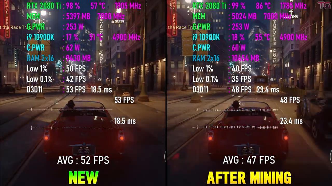 The main culprit for the loss in gaming performance can be attributed to the GPU clock speed and temperature of the Mining card. There was actually a 100MHz drop in boost frequency for the mining card, due to the fact that the mining card was almost 14-16C hotter than the brand new RTX 2080 Ti, which hindered the overall performance.