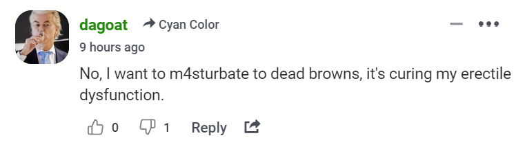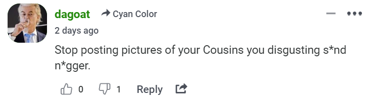 I’ve attached some screenshots as proof of dagoat’s awfulness. He’s just a cursing parrot “pakis/blacks/browns/indians/arabs/maybe even asians” he’s like a cancer nobody likes him as he respects no one. I think you should consider some action. It’s up to you but what I see is a c*rsing parrot sh*ting diarrhea all over the place.