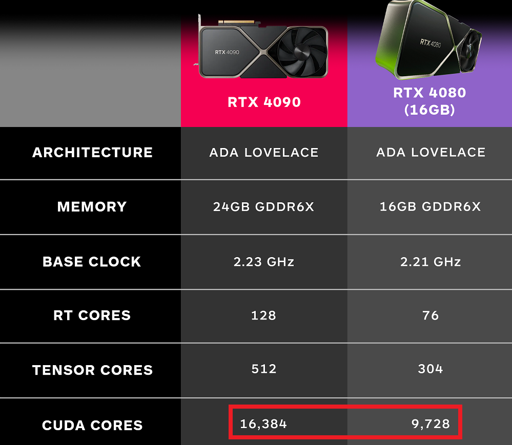that is 68% more cores and will run at slightly lower boost speeds. plus it never comes close to scaling good on the highest skus. and look at all the other benchmark numbers between the 4080 16gb and 4090 and you will see the rest make sense.