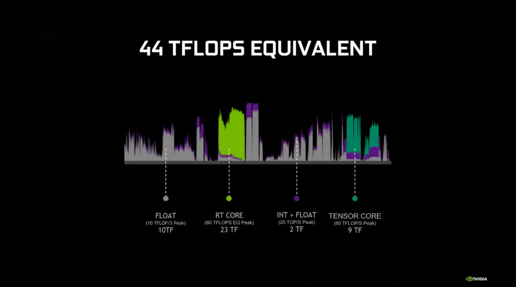 Overall, it looks like FP32 and INT32 are responsible for 12 TFLOPs, while the RT cores enable 23 TFLOPs, and the Tensors gives 9 TFLOPs of rendering performance. Slides from the conference.