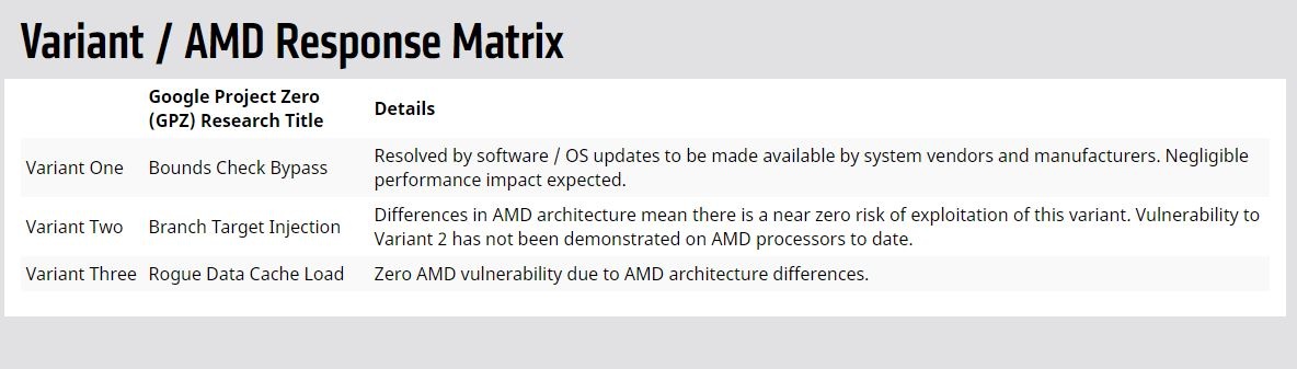 AMD is only vulnerable to variant 1 (spectre), which is easily resolved with basically no performance hit. Nice!