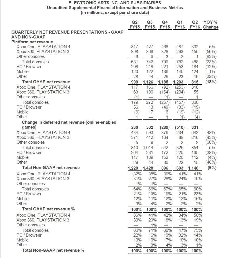 Electronic Arts has issued its Q1 and Q2 2016 financial stats and as we can see, PC remains a really profitable platform for the big publisher. According to EA’s stats, the PC GAAP net revenue was 23% in Q2 2016 and 21% in Q1 2016, whereas the current-gen (PS4 + Xbox One) GAAP net revenue was 41% in both Q1 and Q2 2016. If we assume that PS4 and Xbox One have the same sales, then PC is the leading platform for the company’s GAAP results.