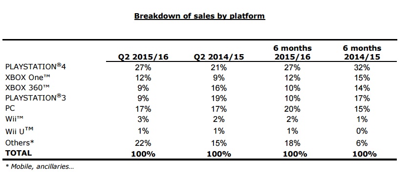 PS4 and Xbox One have managed to retain their sales, however the PC dropped from 23% to 17%. That’s a noticeable decrease, however we do have to note that there weren’t many Ubisoft PC titles in Q2 2016.
