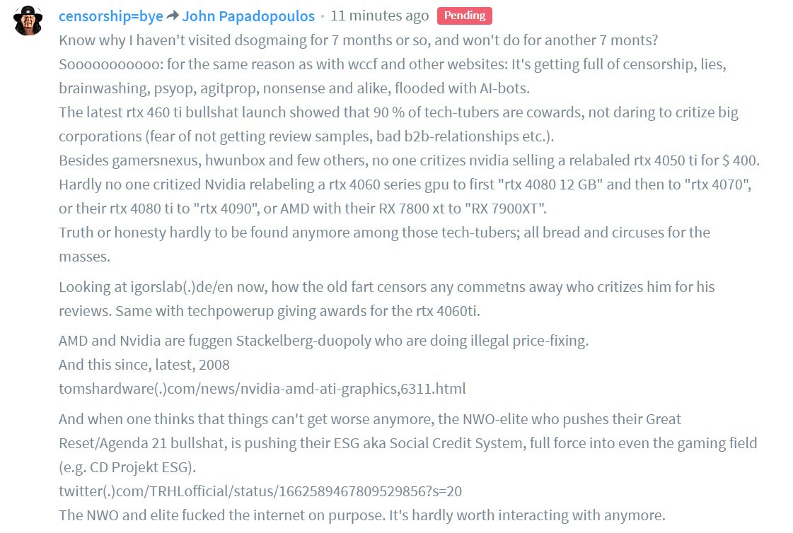 Looking at igorslab(.)de/en now, how the old fart censors any commetns away who critizes him for his reviews. Same with techpowerup giving awards for the rtx 4060ti.