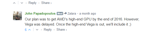We will. It’s just a matter of time. For technical issues (as well as VEGA being delayed) we don’t have one yet. Oh, and NVIDIA does not sponsor us in order to be using its GPUs (it has been mentioned before, it’s inaccurate. We don’t have any deals at all with ANY game publisher or PC hardware vendor)