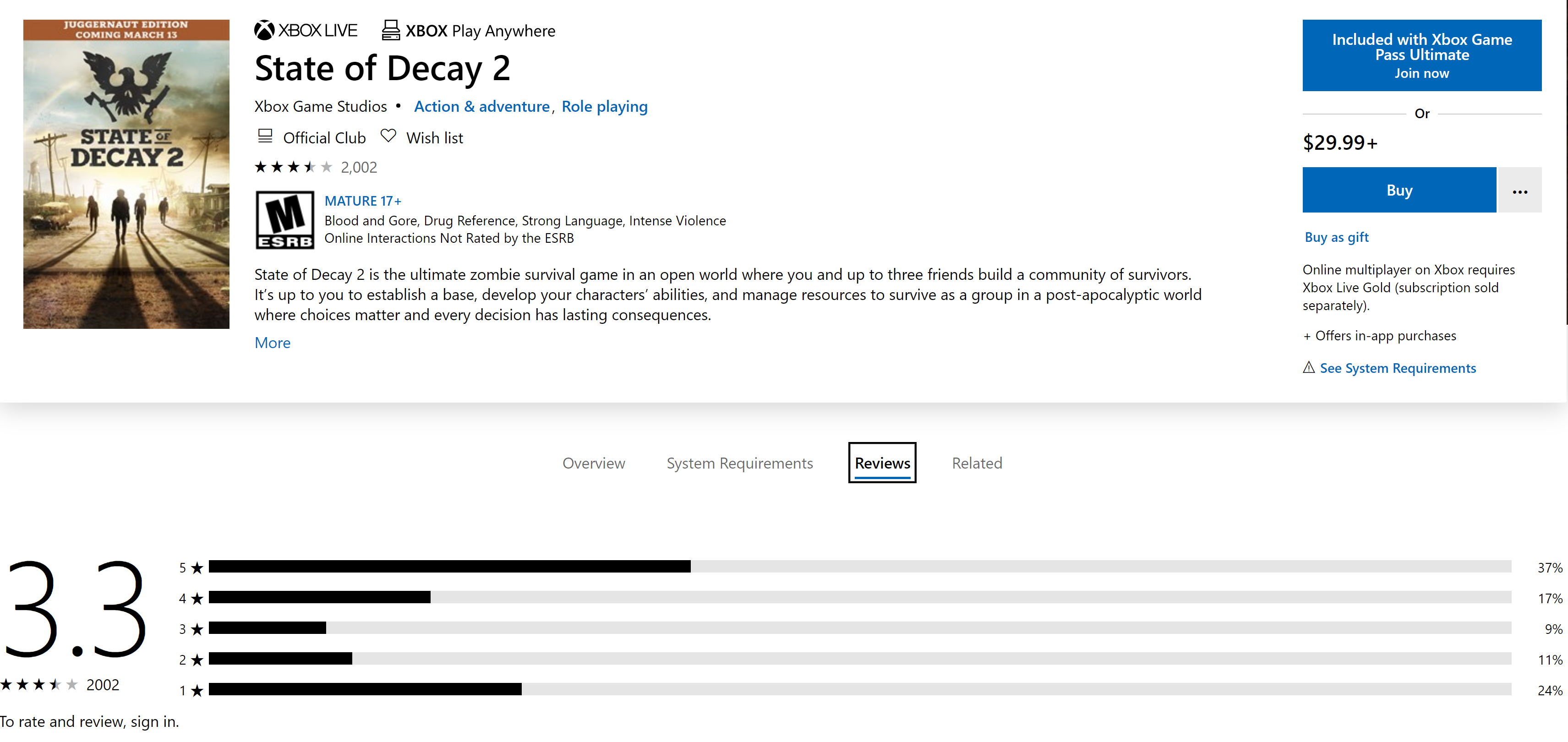 State of Decay 2 had been poorly rated by critics and US Gamers(Metascores [One // PC]): 66 // 69 – US Gamers rating: 3.3/5 so 66/100