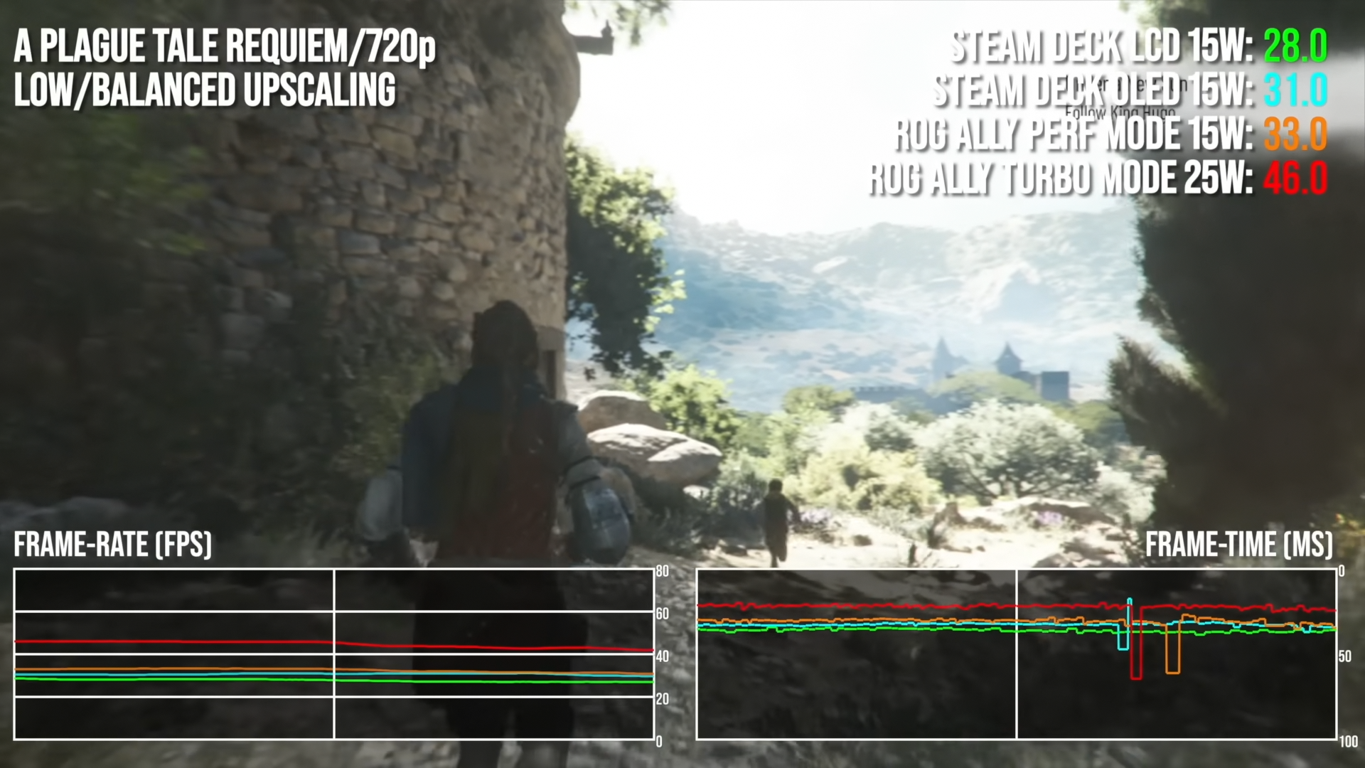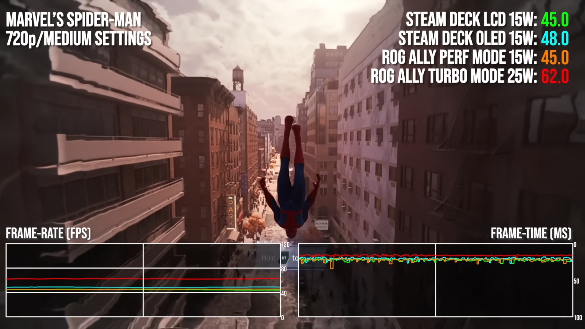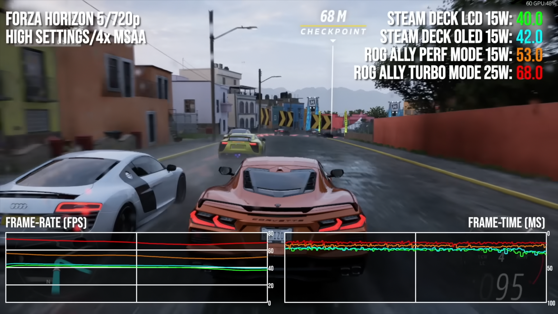 To give you an idea of the current state of SteamOS vs. Windows, here are some random screenshots from a Digital Foundry clip where they compared the Steam Deck to the ROG Ally.