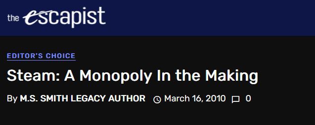 There are things that are bad about Steam imo. Things that I don’t like too. For example I think User Reviews there are mostly worthless and it was just a few hours ago here that I was commenting on the mountain of trash games on Steam that is growing year after year unchecked but by definition they are not even close to a monopoly as defined in common use of the word: