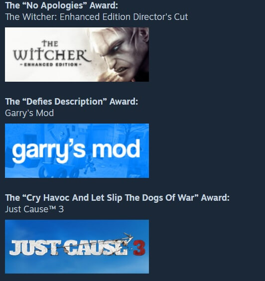 Garry’s Mod won the “Defies Description” award and Just Cause 3 got the “Cry Havoc And Let Slip The Dogs Of War” award. Counter-Strike: Global Offensive got the “Haunts My Dreams” award, Rise of the Tomb Raider got the “Soul Of Vitruvius” award and The Evil Within 2 received the “Whoooaaaaaaa, Dude! 2.0” award.