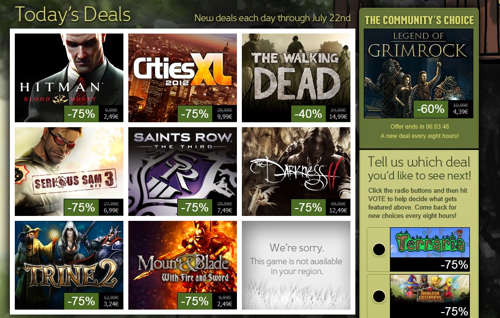 The fourth day of Steam’s Summer Sale is a go and PC gamers can get today Hitman: Blood Money, Serious Sam 3, Saints Row: The Third, The Darkness II, Trine 2 and Mount & Blade: With Fire and Sword with a 75% discount. In addition, The Walking Dead comes with a 40% discount and there are some interesting incoming Community Choices. Moreover, yesterday’s offers will end soon so be sure to give them another quick look.
