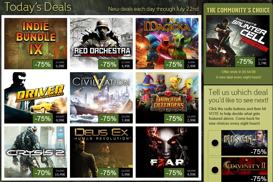 The ninth day of Steam’s Summer Sale is a go and PC gamers can get today the Crysis Collection with 70% and Deus Ex: Human Revolution, F3AR, Magicka, Dungeon Defenders, Red Orchestra 2: Heroes of Stalingrad, Civilization V, and Driver: San Francisco with a 75% discount. As usual, there are other on-going sales on Steam so be sure to check its main page. Enjoy!
