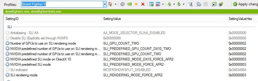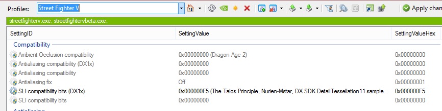 In order to enable SLI in Street Fighter V, you’ll have to use the NVIDIA Inspector Tool, find the game’s profile “Street Fighter V” and do the following changes (SLI compatibility bits: 0x000000F5 ):