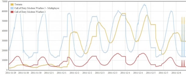 There is no doubt; the playerbase of Terraria is higher than the one of Modern Warfare 3’s in SP mode. Now some might say that it’s all about the MP mode of Modern Warfare 3, and while that is true, it’s really impressive to see such an indie title matching the numbers of a triple-A game. We should also note that Terraria was on Sale with a 75% discount, so that obviously made wonders to the game’s sales. We can even assume that it was one of the reasons we are noticing such a higher playerbase – after December 1st – in the following graph.
