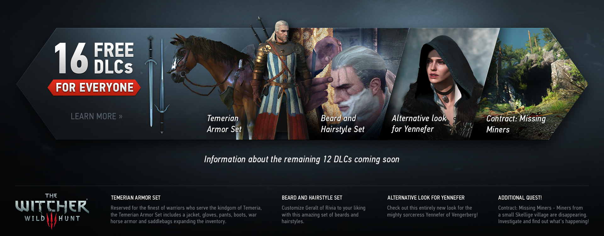 On February 25th, CD Projekt RED will release the first bundle of DLCs (2 of the planned 16) — the Temerian Armor Set (horse armor included) and a Beard and Hairstyle Set for Geralt, the game’s protagonist. After this date, a DLC bundle consisting of two DLCs will be published every week, entirely for free. Gamers are entitled to the free DLC regardless of obtaining the game via pre-order or after launch. Instructions on how to obtain DLCs on specific platforms will be provided at a later date.