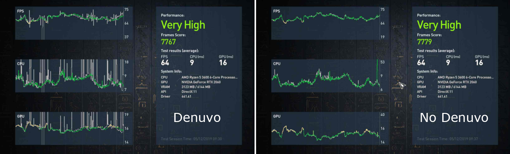 just because the fps value says 64 in both images, doesn’t mean the performance is the same. what matters is how smooth the game runs, and as the graphs show, without denuvo is much more smooth.