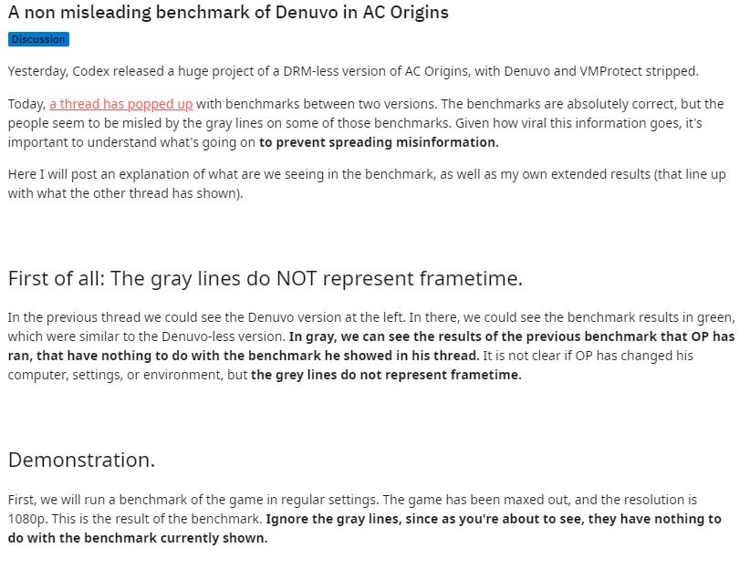 https://www.reddit DOT com/r/CrackWatch/comments/e6p6kc/a_non_misleading_benchmark_of_denuvo_in_ac_origins/