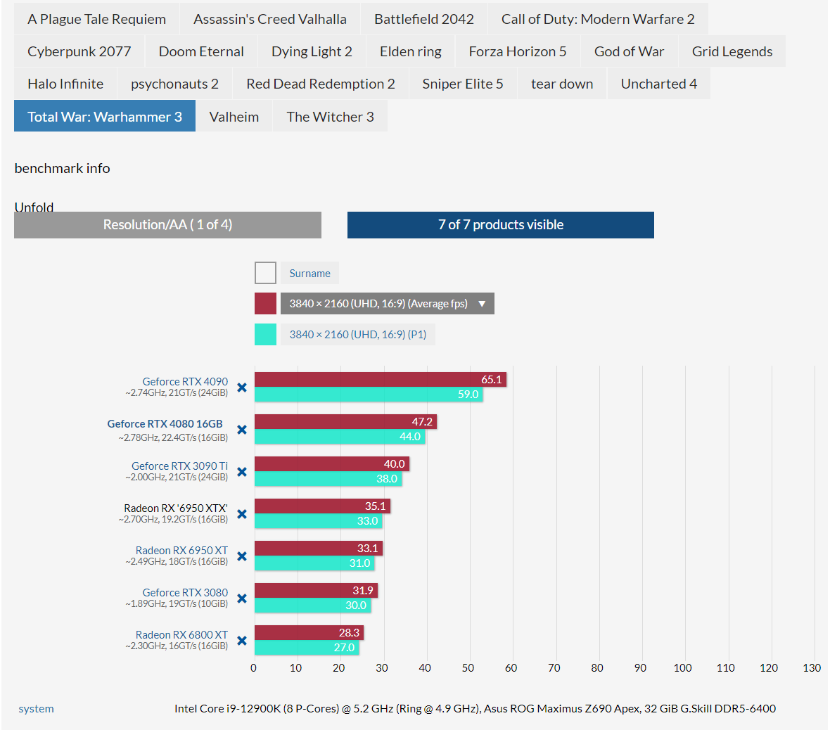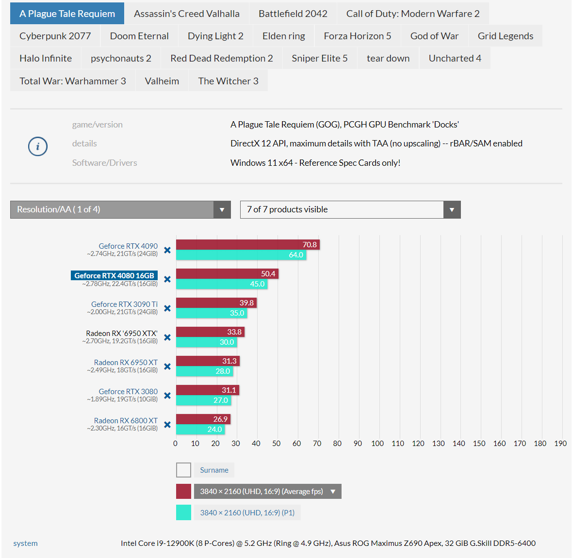 PCGamesHardware has included some really demanding rasterized games, like Total War: Warhammer 3, A Plague Tale: Requiem and Red Dead Redemption 2. At native 4K, the RTX 4080 is unable to offer a smooth gaming experience. Not only that, but in some games the performance increase over the RTX 3090Ti is not that big.