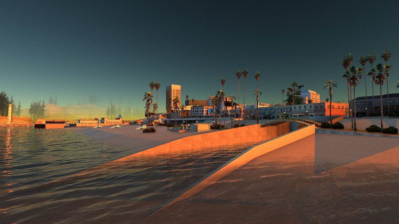 1. Water looks amazing, and clouds also looks nice, but this overblown and fake contrast dosesnt look good and it ruins the game atmosphere. I think gta sa looks the best with skyGfx mod, because this mod brings ps2 original color warm gold atmosphere and filters, that not only looks more filmic, but also blins much better with low quality assets.