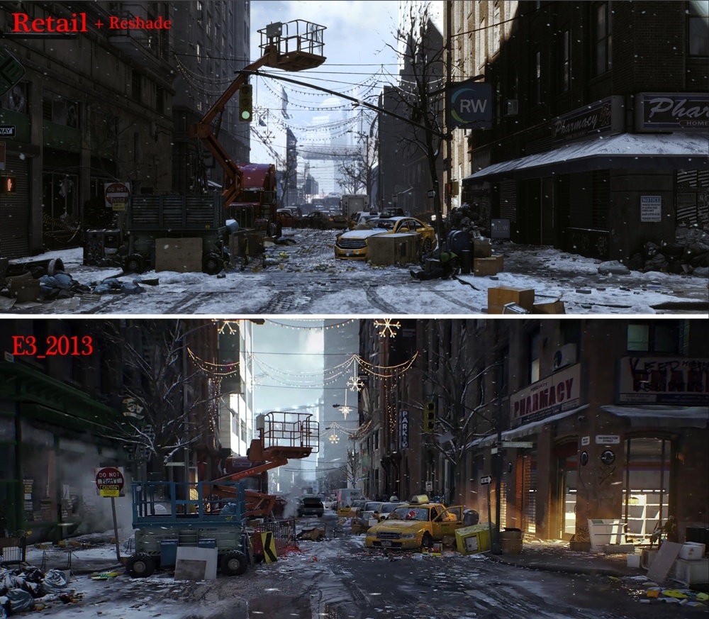 I disagree, Division wasn’t downgraded. It appeared to be, but I did extensive testing when the game came out and compared it to the E3 trailer. Some things changed yes, like the map, the UI, textures for cars etc. But the graphical effects and detailed world were all still there. However, they changed the color/TOD settings to look warmer and thus also made it look quite different, especially the color palette. With Reshade I managed to get pretty close to the E3 color palette, here’s an example I made: