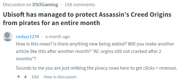 John knows he can milk views from Denuvo articles. He knows that everytime he posts a Denuvo article, Anti DRM, low key pirates, pro DRM guys are gonna have a comment war giving him views and clicks. You can check my post history, I actually called him out a month ago that he was gonna post a Devnuo article about AC: Orgins not being cracked after 2 months LOL.