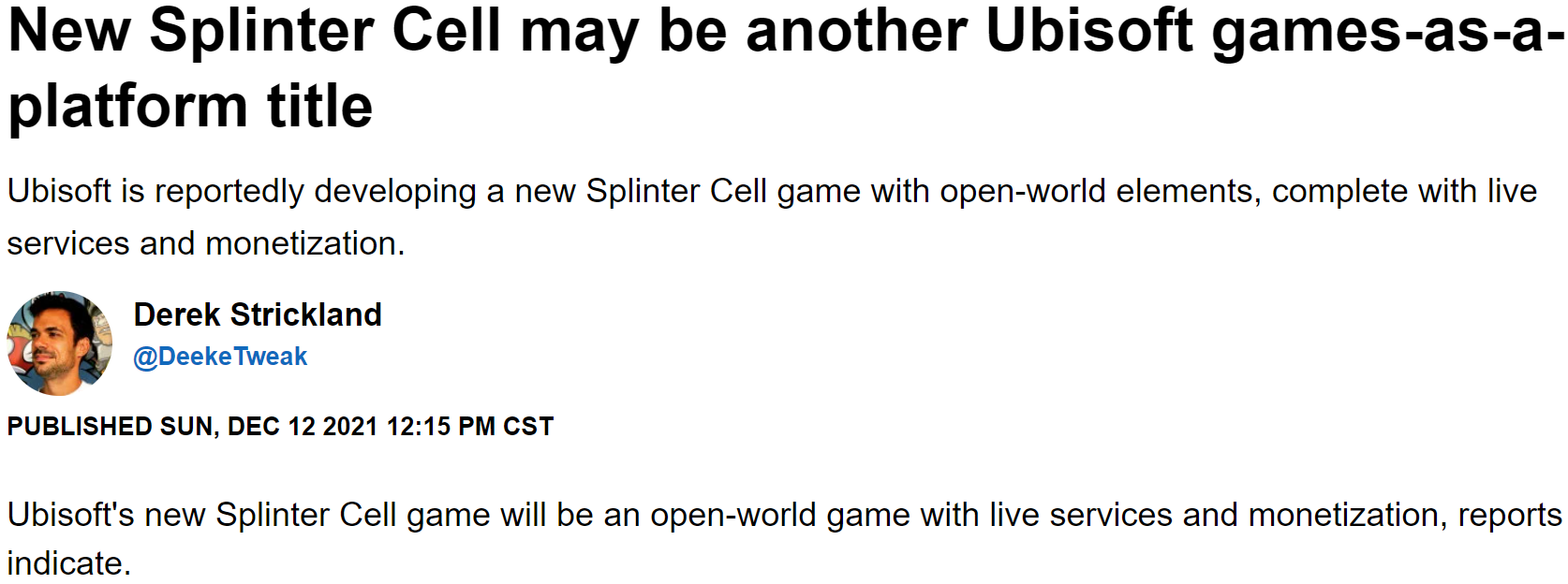 I don’t trust current Ubisoft with the splinter cell franchise at all, expect dumbed down stealth for the casuals and echelon tokens or whatever GAAS crap they will push