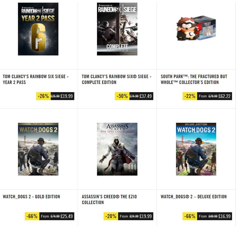 Watch_Dogs 2 received a 66% discount, whereas Ghost Recon Wildlands received a 40% discount. South Park: The Fractured but Whole got a 18% discount while Rainbow Six: Siege got a 50% discount.