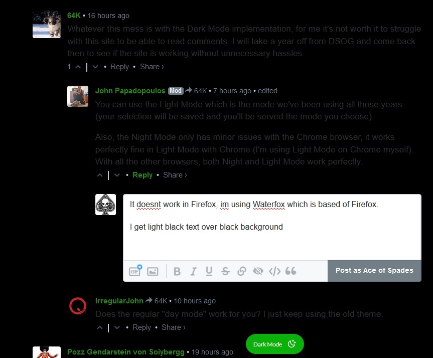 Whatever this mess is with the Dark Mode implementation, for me it’s not worth it to struggle with this site to be able to read comments. I will take a year off from DSOG and come back then to see if the site is working without unnecessary hassles.