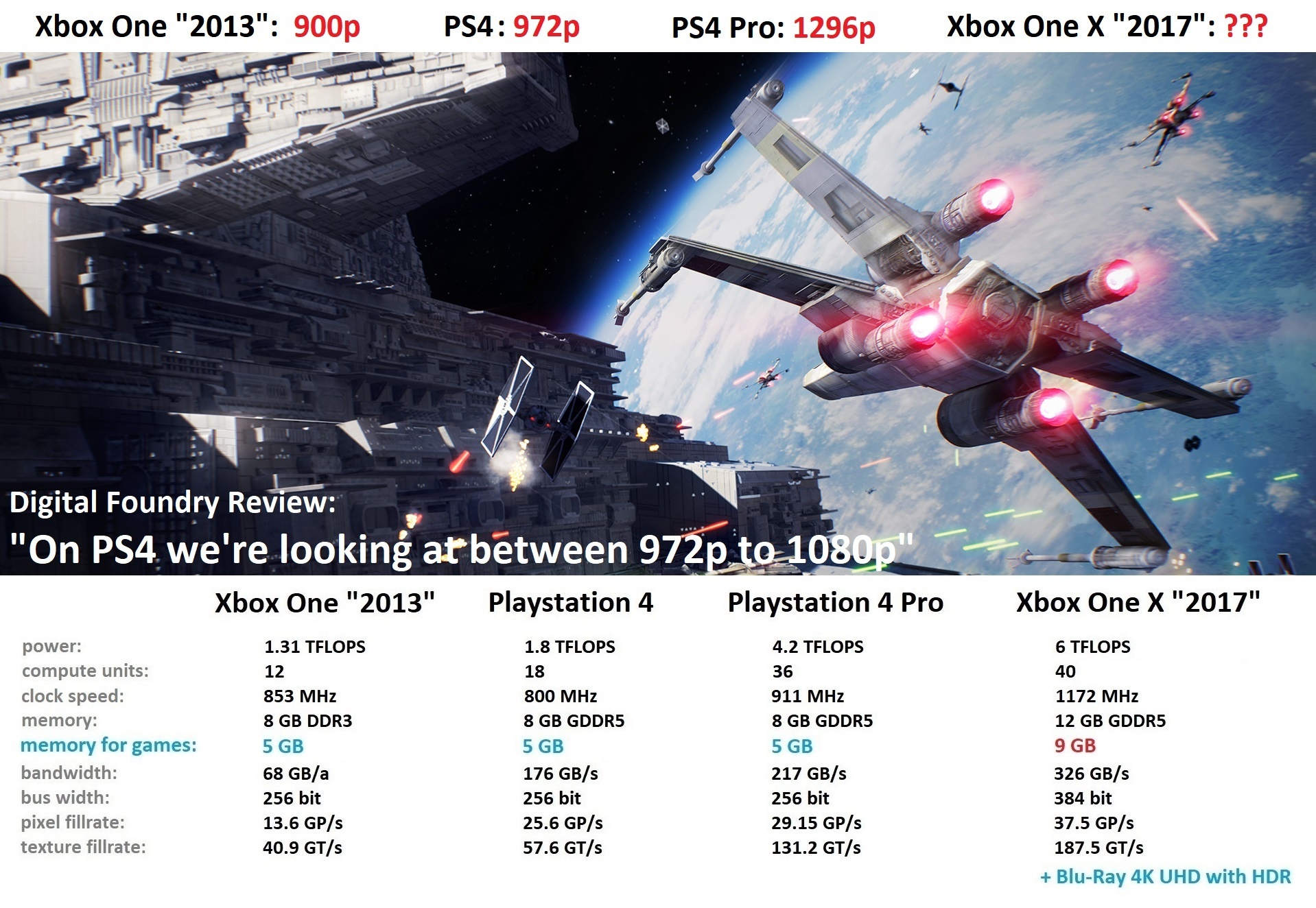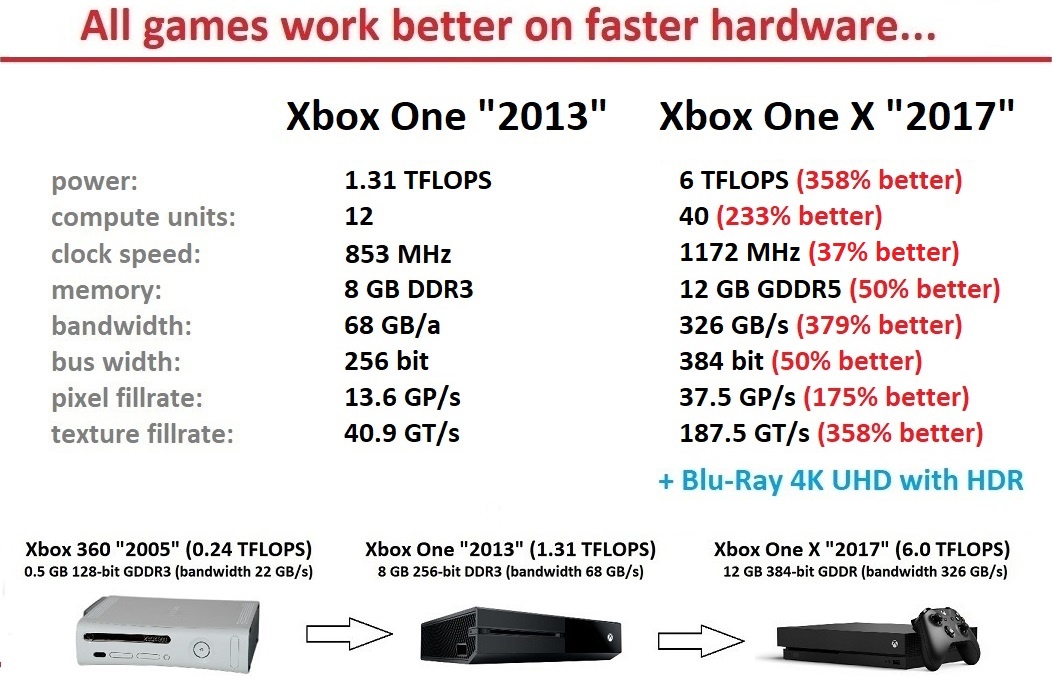 3. 99.99% of peasants know nothing about numbers like this. They dont care if it have 500megabit / minute / terraflipflop. The see the new box what everyone have a d they buy it . Get all the 3 games what good for and play then for a year cuz there is nothing new on them .halo 6 forza 9 fifa 69 . And HW specs ? U wanna tell me HW specs . Arent shadow of war locked at 30 fps ? And evil with in2 ? And destiny 2 ? HEH ?
