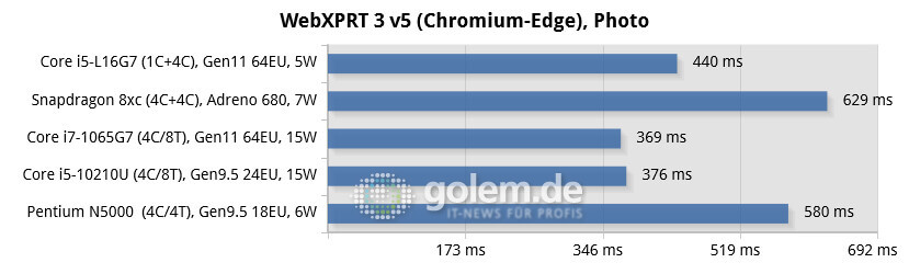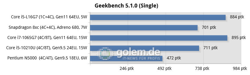 It should be noted that the Core i5-L16G7 processor has an SDP (Scenario Driven Power) of 7 W, while the value of PL1 at load is also 7 W, the PL2 at maximum load is actually 9.5 W, which applies for a TAU value of 28 seconds. However, this ultimately depends on the specific implementation of the processor in a particular laptop Model, where the PL2 may be just 7 W. In the testing done by Golem.de, the Lakefield and its SNC core worked under load mostly at 2.5 GHz clock speed, and occasionally it was hitting 2.9 GHz as well.