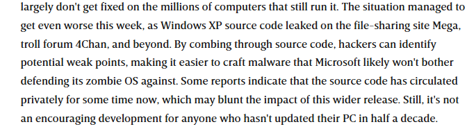 It was always possible to reverse engineer Windows to find bugs, but by having the source, it makes it much easier to get a detailed look into the inner workings of the Windows operating system. If exploitable bugs are found in the Windows XP source code, and the code is still used in Windows 10, threat actors could exploit the bug in the modern version of the operating system. One Windows internals expert has already found Microsoft’s NetMeeting user certificate root signing keys.
