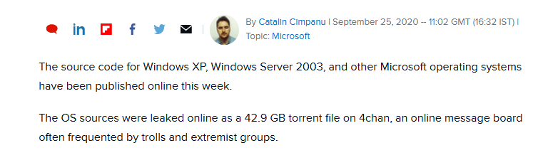 According to reports, the source code for both operating systems was shared via torrents on file-sharing websites. The OS source code was leaked online as a 42.9 GB torrent file on 4chan, an online message board often associated with internet trolls and extremism. The content of this torrent file includes source code for several of Microsoft’s older operating systems, such as Windows 2000, Embedded (CE 3, CE 4, CE 5, CE, 7), Windows NT (3.5 and 4), XP, and Server 2003.