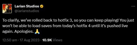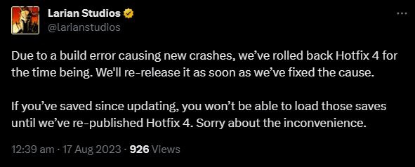 As I expected, Larian just rolled back Hotfix 4. The Hotfix has only been live for just over an hour, so not that many people should be affected.