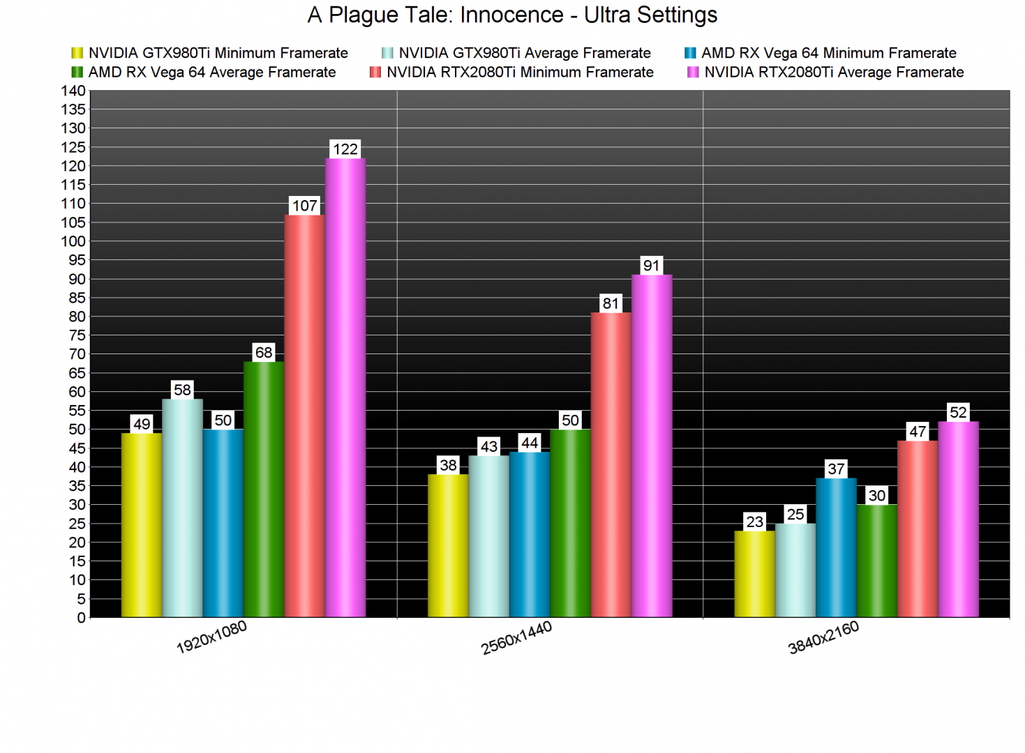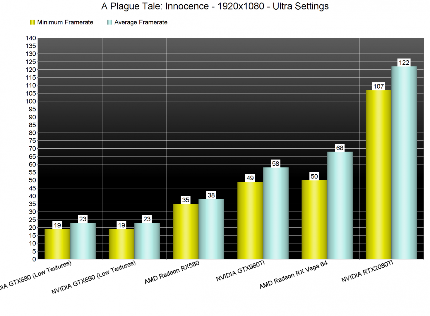 A Plague Tale: Innocence can be easily described as a GPU-bound title. At 1080p and Ultra settings, even our NVIDIA GeForce RTX2080Ti was used to its fullest. In our GPU-heavy benchmark scene, our AMD Radeon RX Vega 64 was unable to offer a constant 60fps experience and our NVIDIA GeForce GTX980Ti was unable to offer a smooth experience. The only GPU that was able to push high framerates was our NVIDIA GeForce RTX2080Ti.