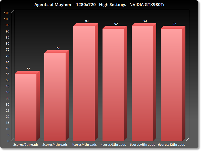 Given its open-world nature, we expected Agents of Mayhem to rely heavily on the CPU. And we were right. In order to find out how the game performs on a variety of CPUs, we simulated a dual-core and a quad-core CPU and as we can see in the previous, the game scaled on all six cores. However, we did not notice any performance differences between our simulated quad-core and our six-core systems.