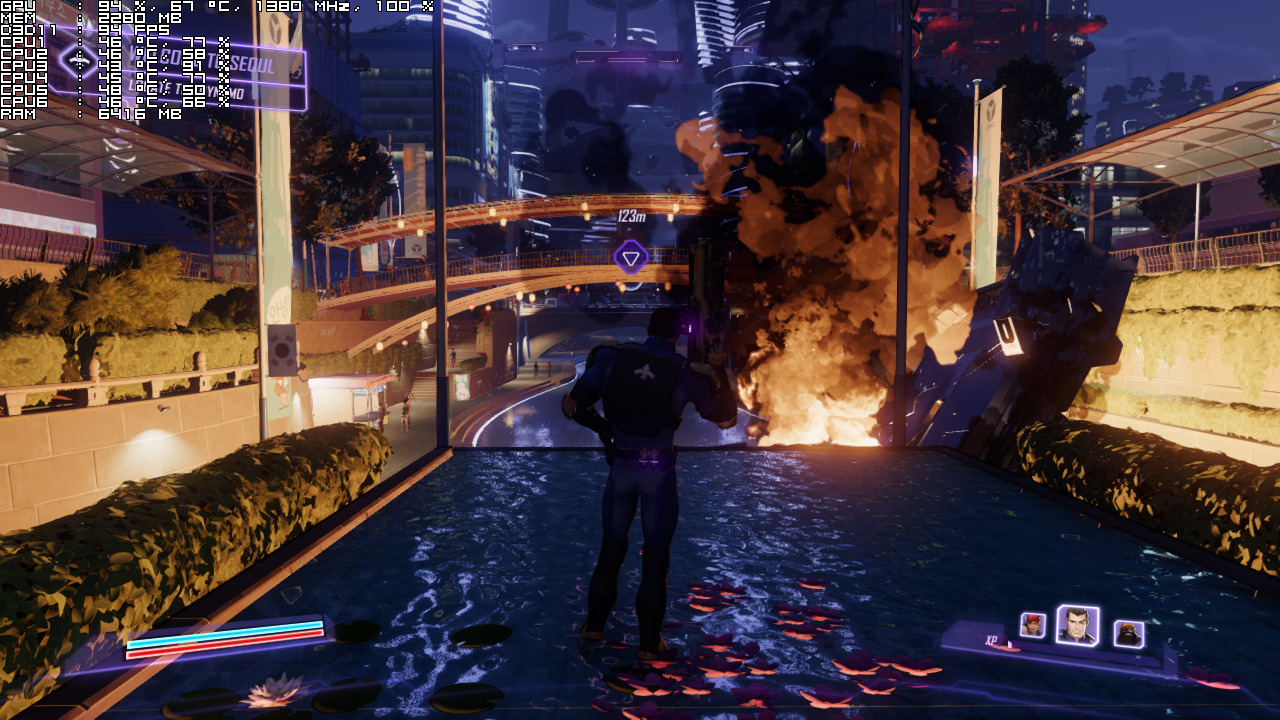In case you did not notice, Agents of Mayhem is one of the most demanding titles to date on Ultra settings. Hell, even without NVIDIA’s effects we were still unable to maintain a 60fps experience on our GTX980Ti. And to be honest, the visuals that are on display here do not justify these GPU requirements (at least in our opinion). The game has a lovely cartoon style, the main characters are well designed, there are a lot of explosions, and there are some cool reflection effects. However, the game suffers from pop-in of objects (even on Ultra settings), we did notice some low-res textures, environmental interactivity and overall destruction are limited, and we did not experience anything that wow-ish or next-gen-ish (or anything that could justify these high GPU requirements).
