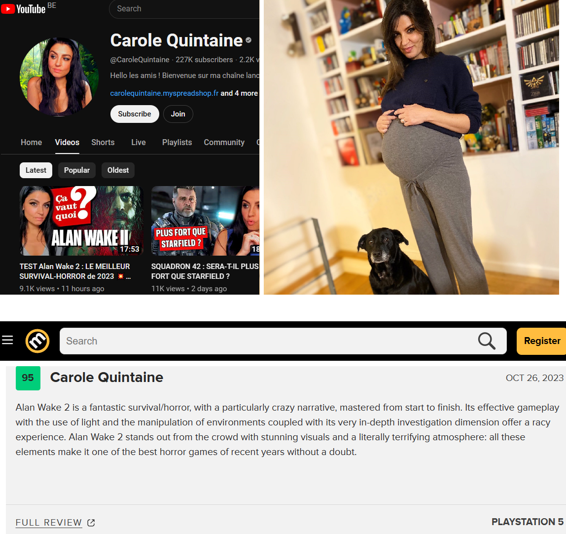 The latest critic score added to Alan Wake 2 is from a site called “Carole Quintaine”. It’s literally a one-woman-show, where she alone runs the site where she sells t-shirts, and a Youtube channel where she uploads videos.