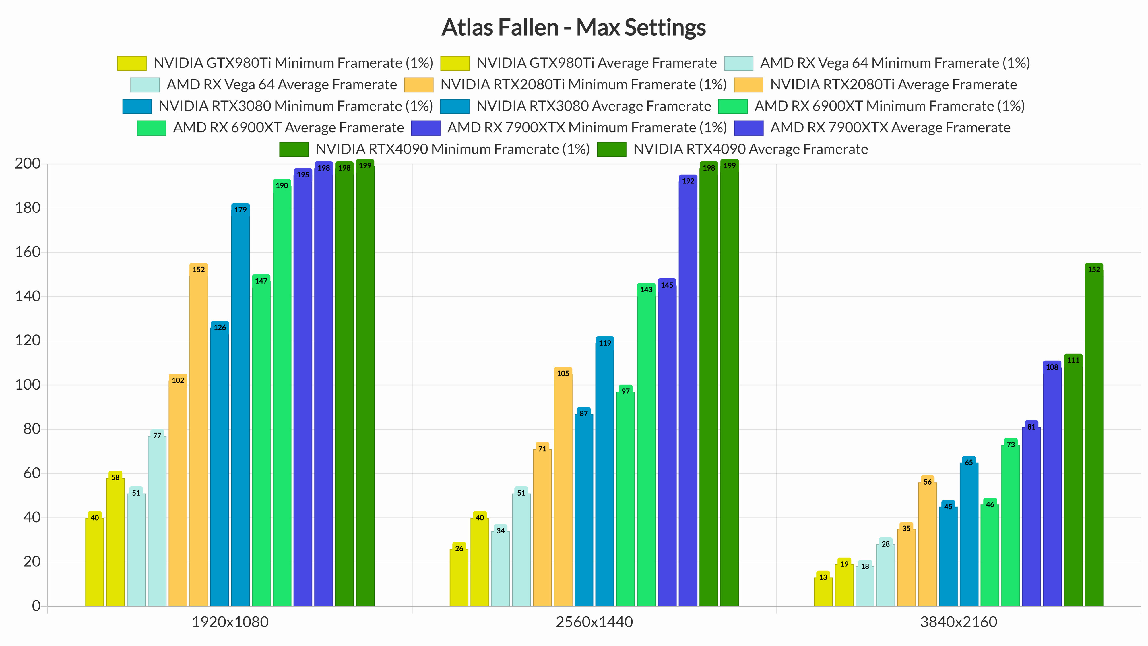 At 1440p/Max Settings, our NVIDIA RTX2080Ti, RTX3080, RTX4090, AMD RX 6900XT and RX 7900XTX had no trouble running the game. And as for native 4K/Max Settings, the only GPUs that were able to provide framerates higher than 60fps at all times were the NVIDIA RTX4090 and the AMD Radeon RX 7900XTX.