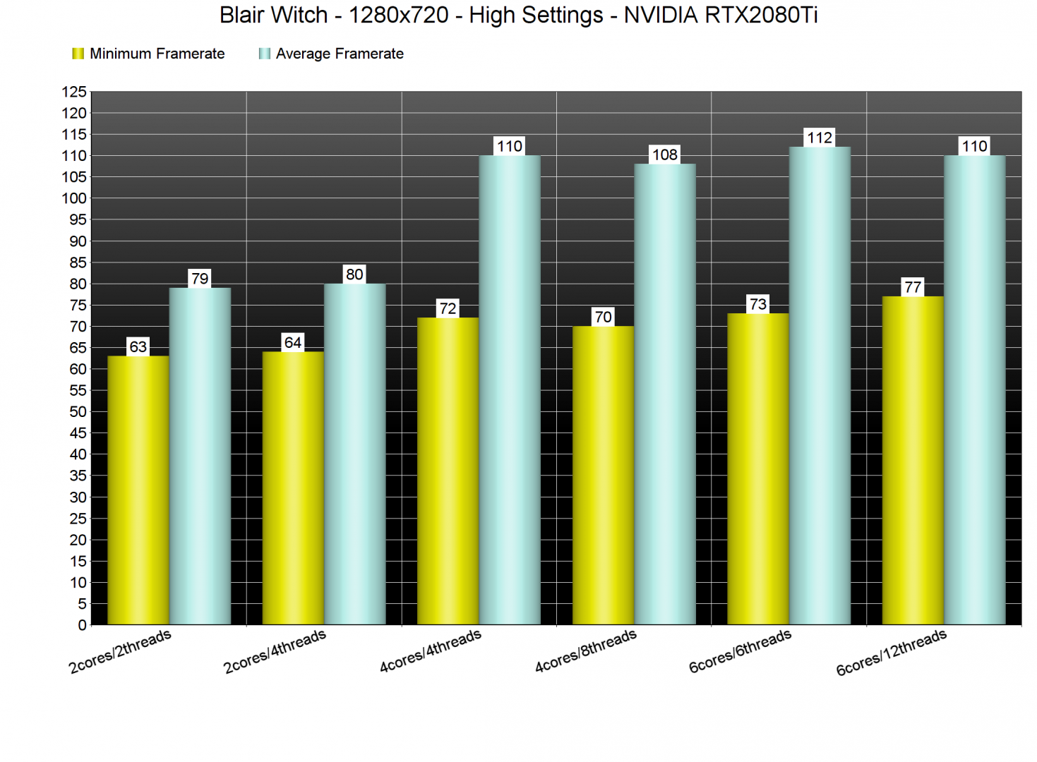 In order to find out how the game scales on multiple CPU threads, we simulated a dual-core and a quad-core CPU. Blair Witch uses DX11 and appears to be mainly single-threaded. Moreover, the game relies heavily on the memory frequency, something that may bottleneck older PC configurations. Still, and despite these shortcomings, even our simulated dual-core system was able to run the game with constant 60fps. Therefore, in order to enjoy this game at 60fps, PC gamers will not need a high-end CPU. On the other hand, those targeting 120fps will have to use a modern-day CPU.