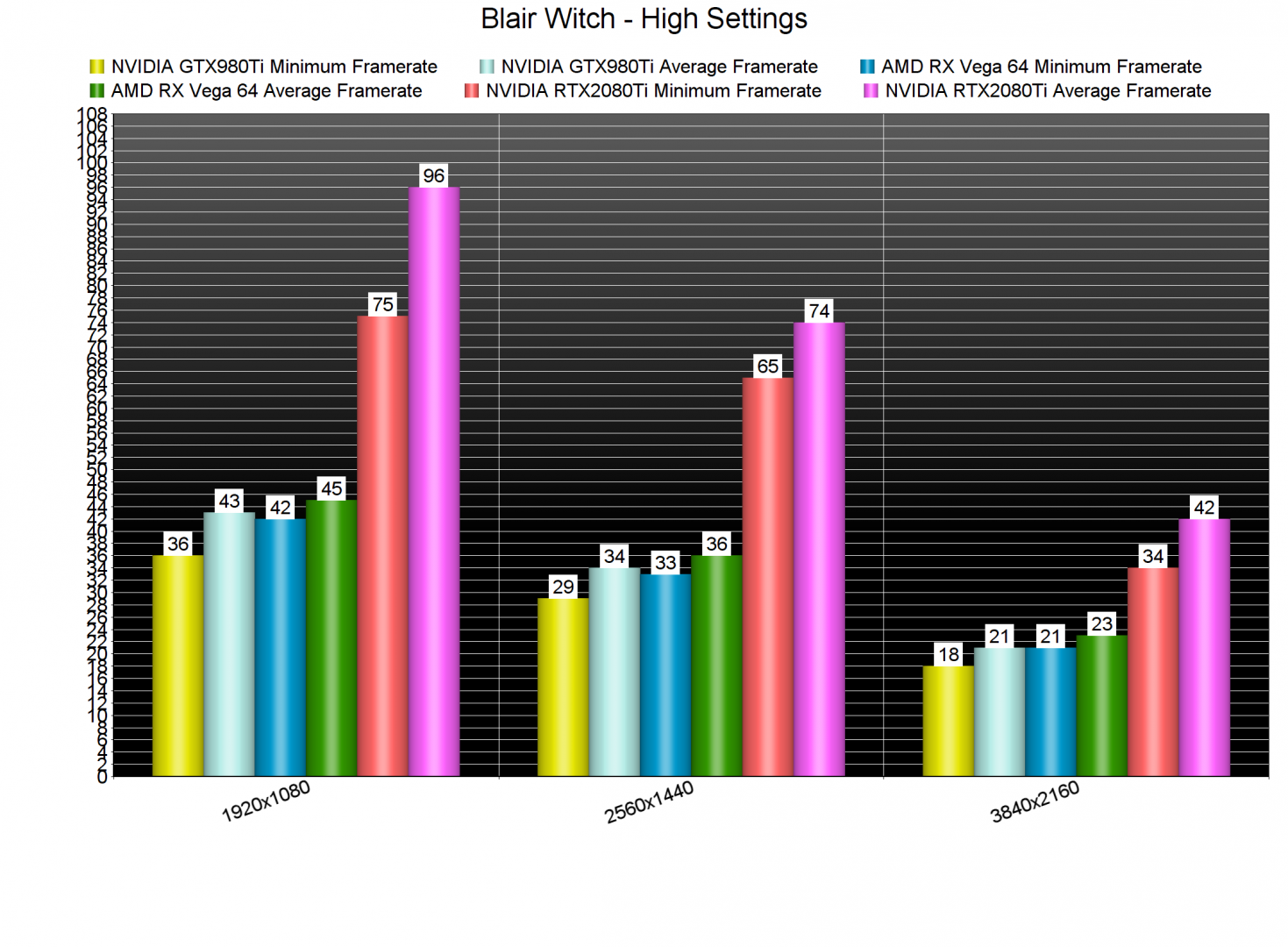 Despite its somehow “okay-ish” CPU requirements, Blair Witch requires a high-end GPU in order to be enjoyed, even at 1080p. Not only that, but the game under-performs on AMD’s hardware. We know that some Unreal Engine 4 games perform horribly on AMD’s hardware, however in this particular game the GTX980Ti was able to match the performance of the AMD Radeon RX Vega 64.