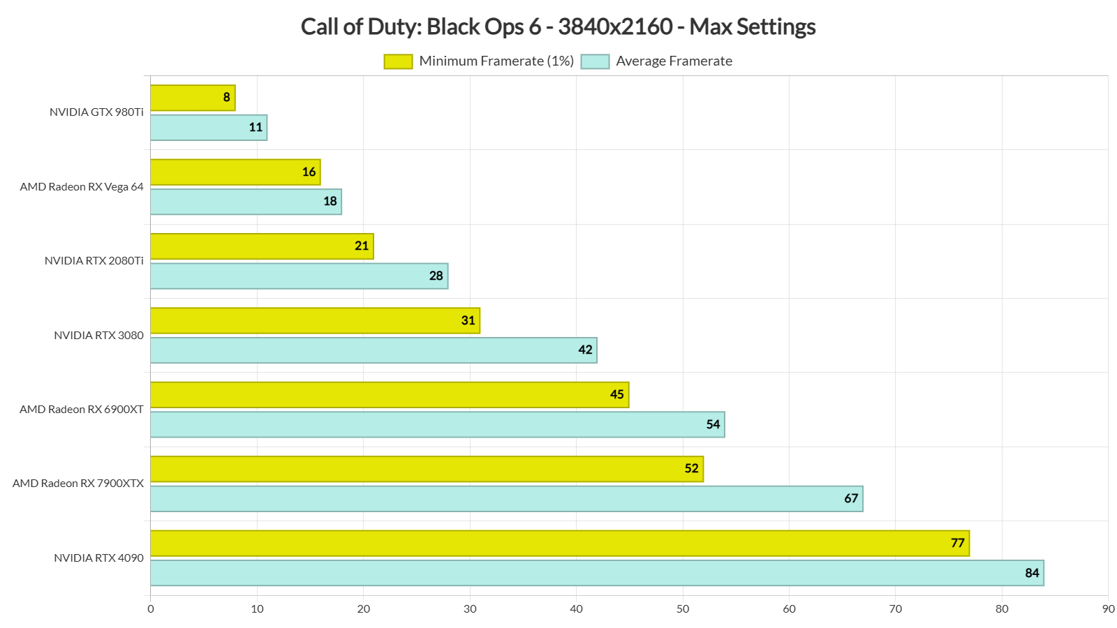 Finally, at native 4K/Max Settings, the only GPU that was able to provide over 60fps at all times was the NVIDIA RTX 4090. The AMD Radeon RX 7900XTX was also able to offer a somehow smooth gaming experience, provided you use a FreeSync monitor.
