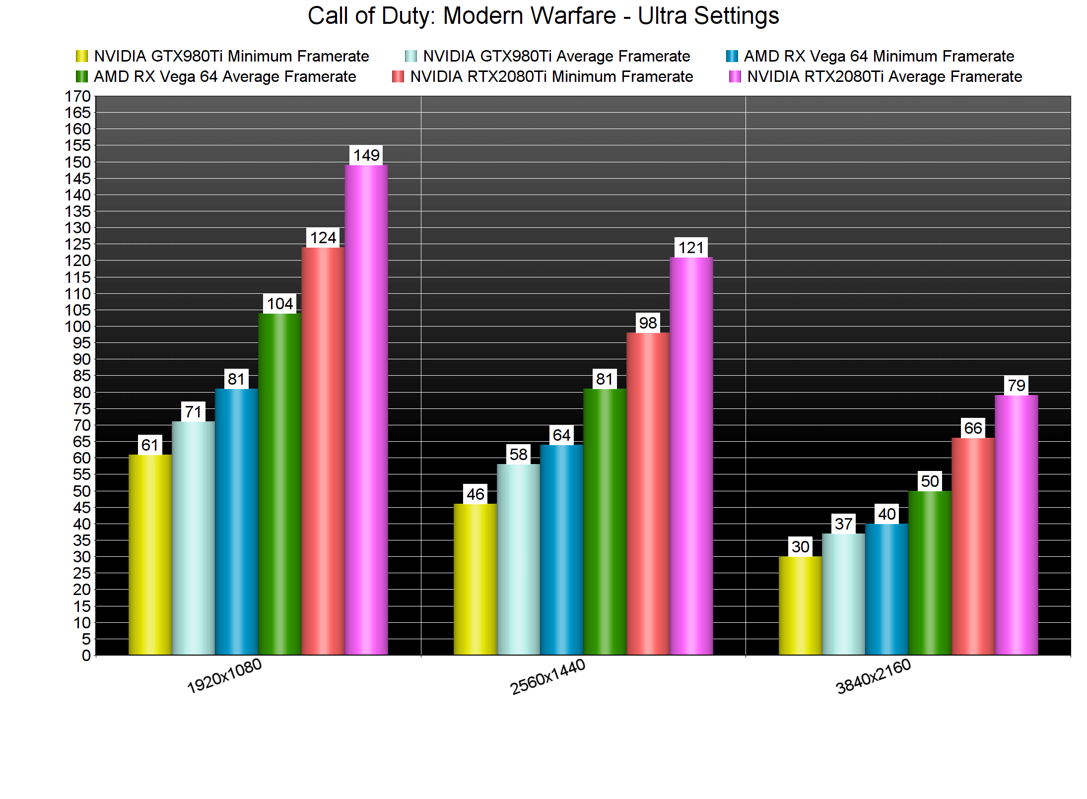It’s worth noting here that COD: MW is one of the few games that runs great even on AMD’s hardware. Both our Radeon RX Vega 64 and NVIDIA RTX2080Ti were able to run the game smoothly at 2560×1440. As for 4K/Ultra, the only GPU that was able to offer a constant 60fps experience was the NVIDIA RTX2080Ti.