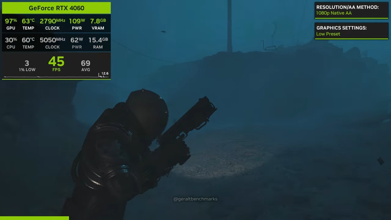 Game drops to 45fps…….in 1080p low……on $300 RTX 4060….GPU at 97%: