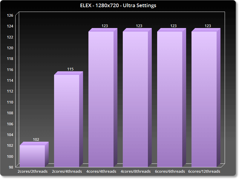 Like its predecessor, ELEX does not require a high-end CPU. In order to find out how the game performs on a variety of CPUs, we simulated a dual-core and a quad-core CPU. For our CPU tests, we used an open-world scene with a large view distance and various characters on-screen. We also lowered our resolution to 720p and the render resolution to 50% (so we could avoid any possible GPU limitations) but kept using the Ultra settings. Also, it appears that there is a framerate lock at 123fps.