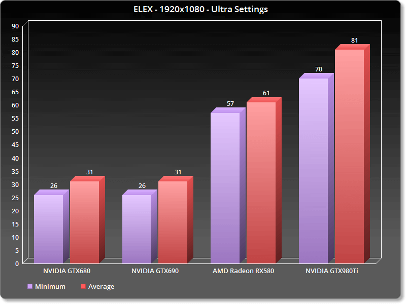 As such, ELEX can be described as a GPU-bound title. At 1080p and on Ultra settings, our GTX980Ti was able to run the first two chapters with an average of 81fps and a minimum of 70fps. The AMD Radeon RX580 was able to push an average of 61fps and a minimum of 57fps. And since the game runs at 30fps on consoles on lower settings, a GTX680 actually provides a better experience than the base PS4 and Xbox One.